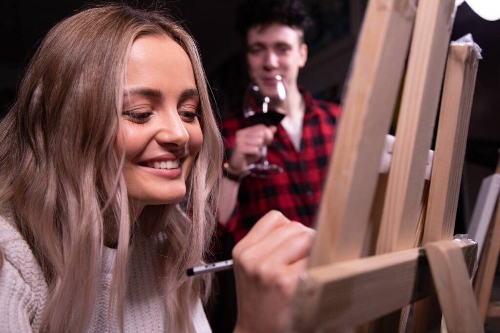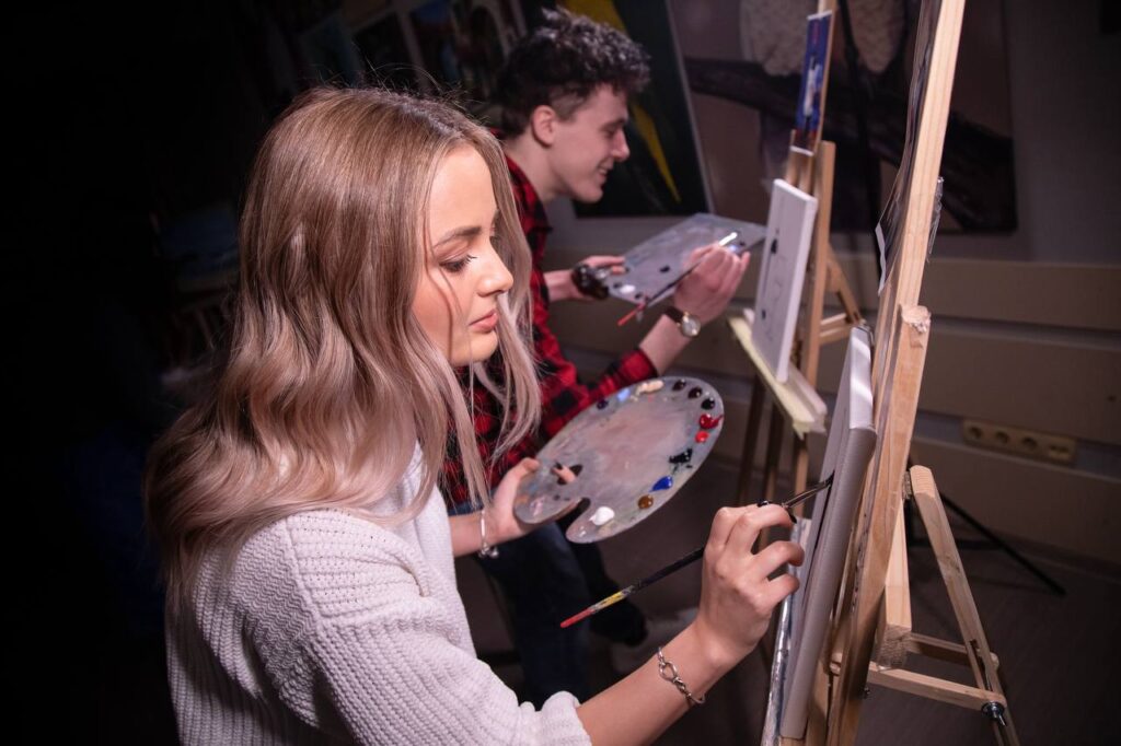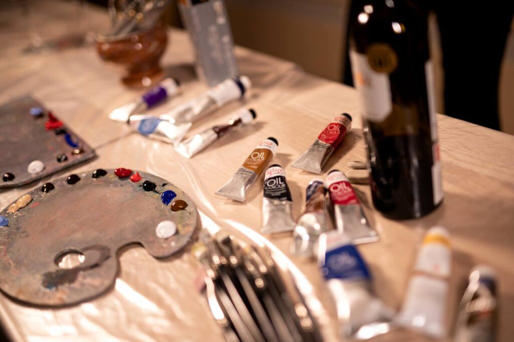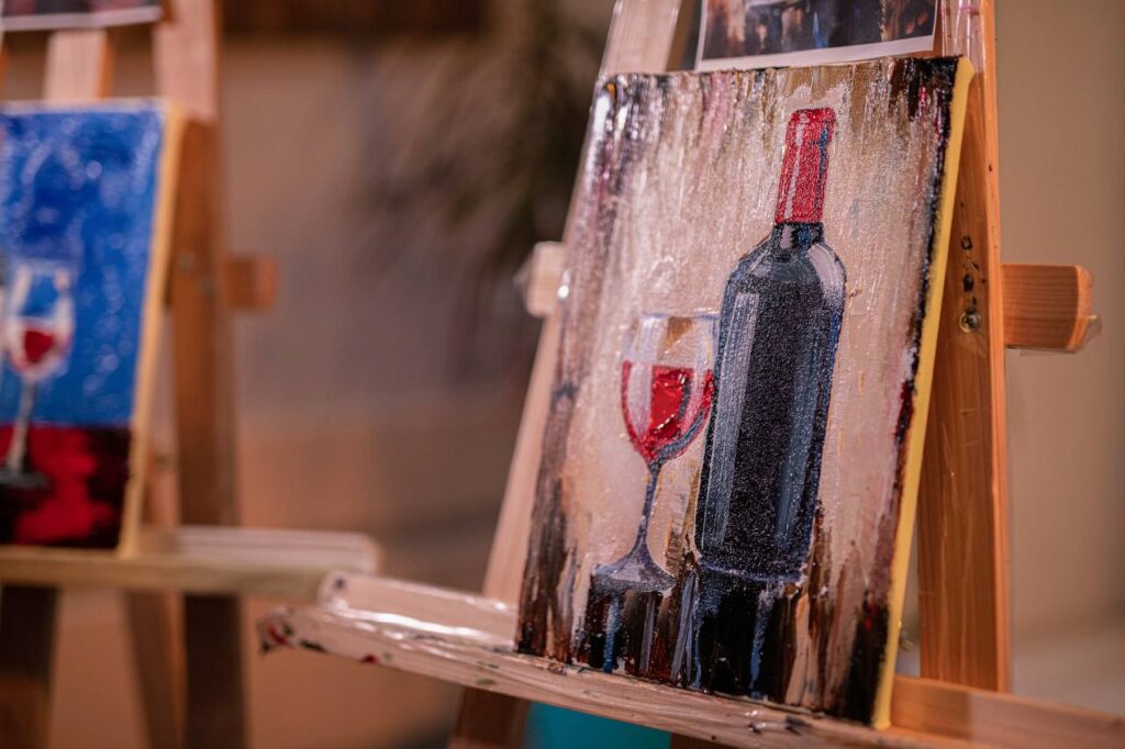 Творче заняття у затишній атмосфері у невеликій групі. Протягом 2,5 години учасники створюють власні картини та насолоджуються напоями: червоне чи біле вино, кава, чай або вода. До вина подаються солодощі.